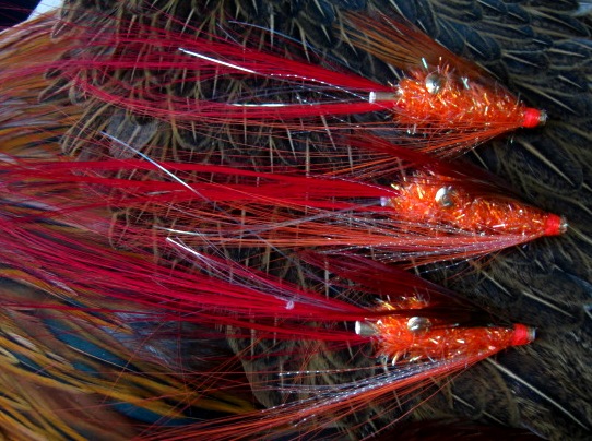 | Feather barbs have a very slight profile, perfect for legs and feelers on prawn and shrimp flies too. Below is Burnt Heron on our "Brass Eyed Prawn" |
