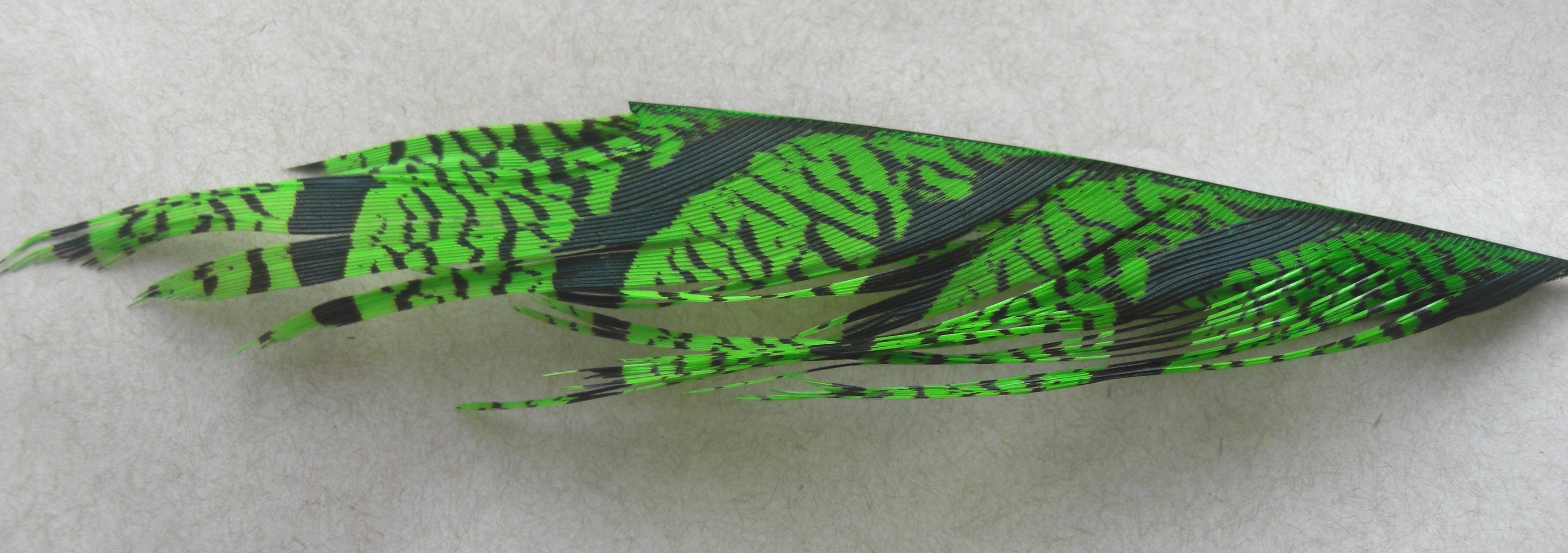 | These five inch long,Lady Amherst Center Tail sections are chosen from extra select, measure out at over three inches long! The fibers add life to any long, webby pattern and are fantastic for intruders! |