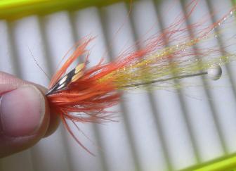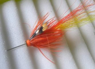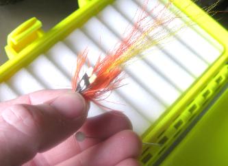 | Hold your tube fly at its head, push the pin in to the tube from the rear of the fly, then push the pin into the slotted foam. |