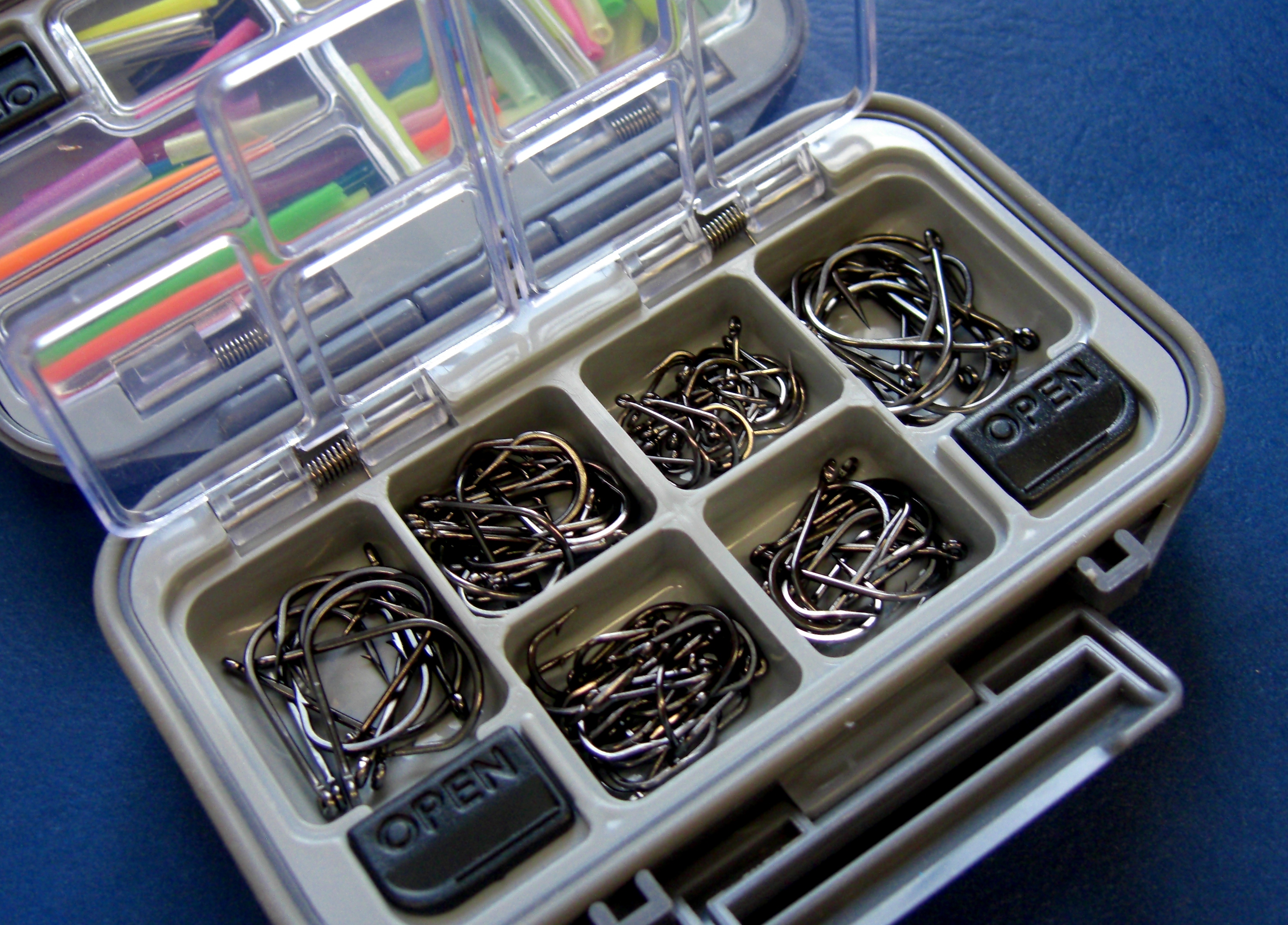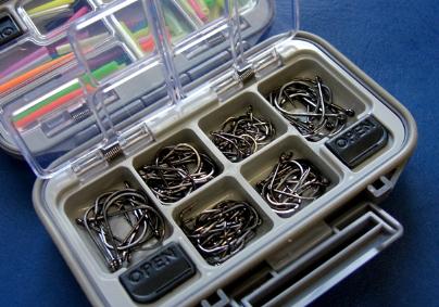| Who hasn't had the pleasurable experience of opening a tiny bag of hooks stream-side and having them fall into the river or onto the shore? We've packaged all sizes of our Egret Hooks (freshwater kit) and Egret Octopus Hooks (saltwater kit), put them together with a large selection of junction tube, and put them in a fantastic little box. Not only do you save a few dollars on the goods but the hook box is indestructible and water tight. |